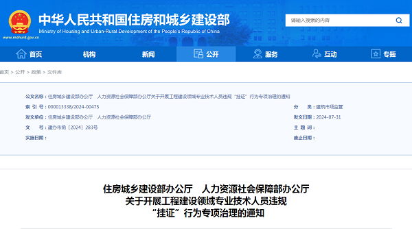 住建部聯(lián)合人社部發(fā)布《關(guān)于開展工程建設(shè)領(lǐng)域?qū)I(yè)技術(shù)人員違規(guī)“掛證”行為專項(xiàng)治理的通知》:
